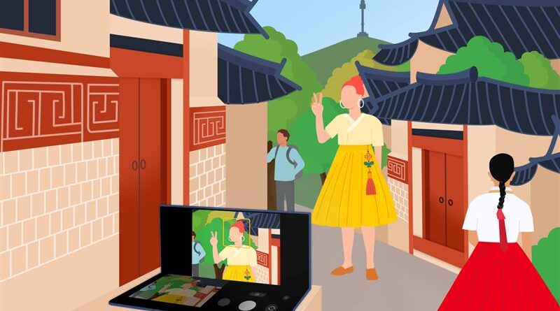 Tu primer día comienza en el pueblo tradicional de Bukchon Hanok — el escenario ideal para tu vlog. ¿No trajiste tripié? No pasa nada. Apoya el Galaxy Z Fold7, activa FlexCam y con Auto Tracking siempre estarás centrada en el encuadre mientras capturas los hanoks detrás.
